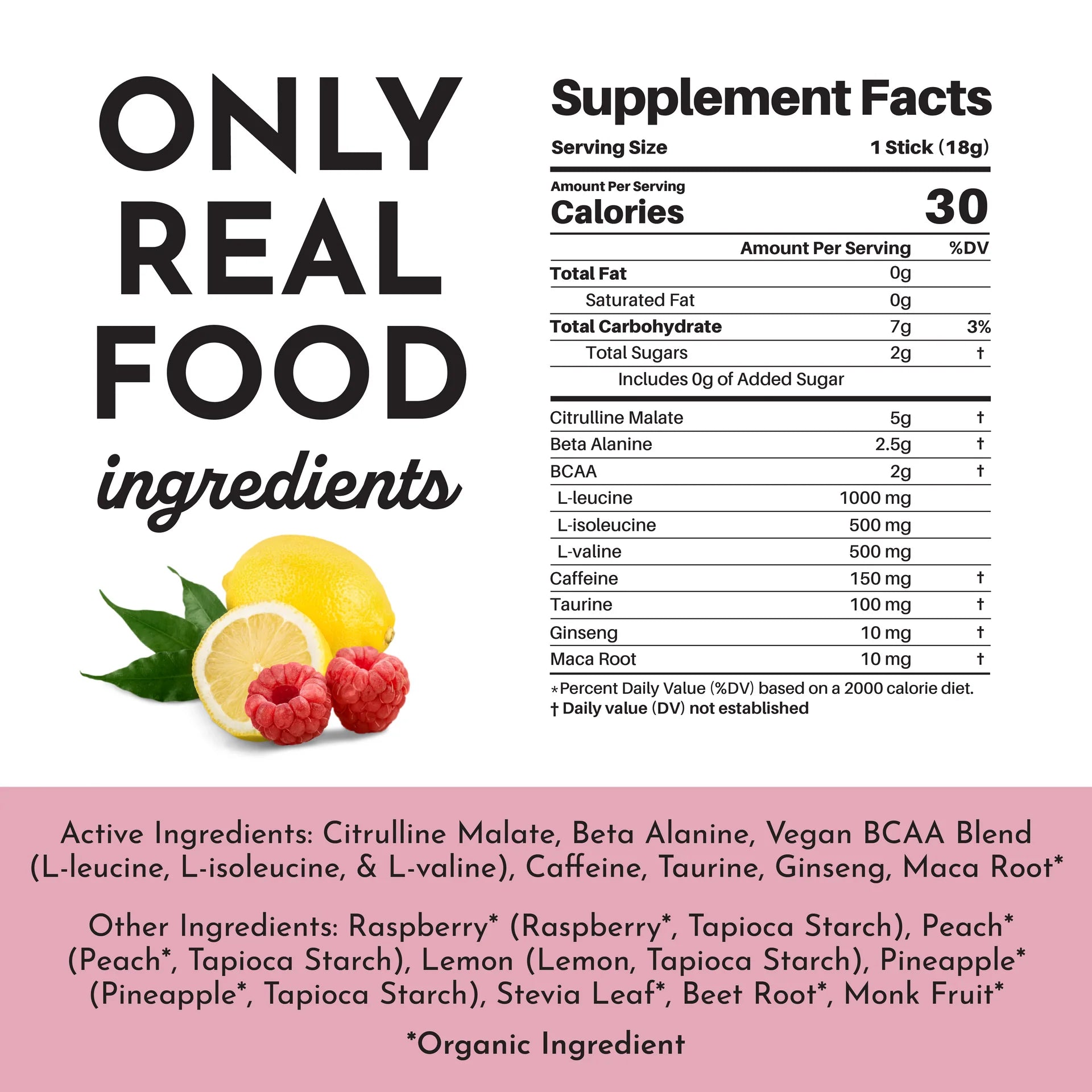 Organic Raspberry, Organic Peach, Lemon, Organic Stevia Leaf, Tapioca Starch, Organic Pineapple, Organic Beet Root, Organic Monk Fruit